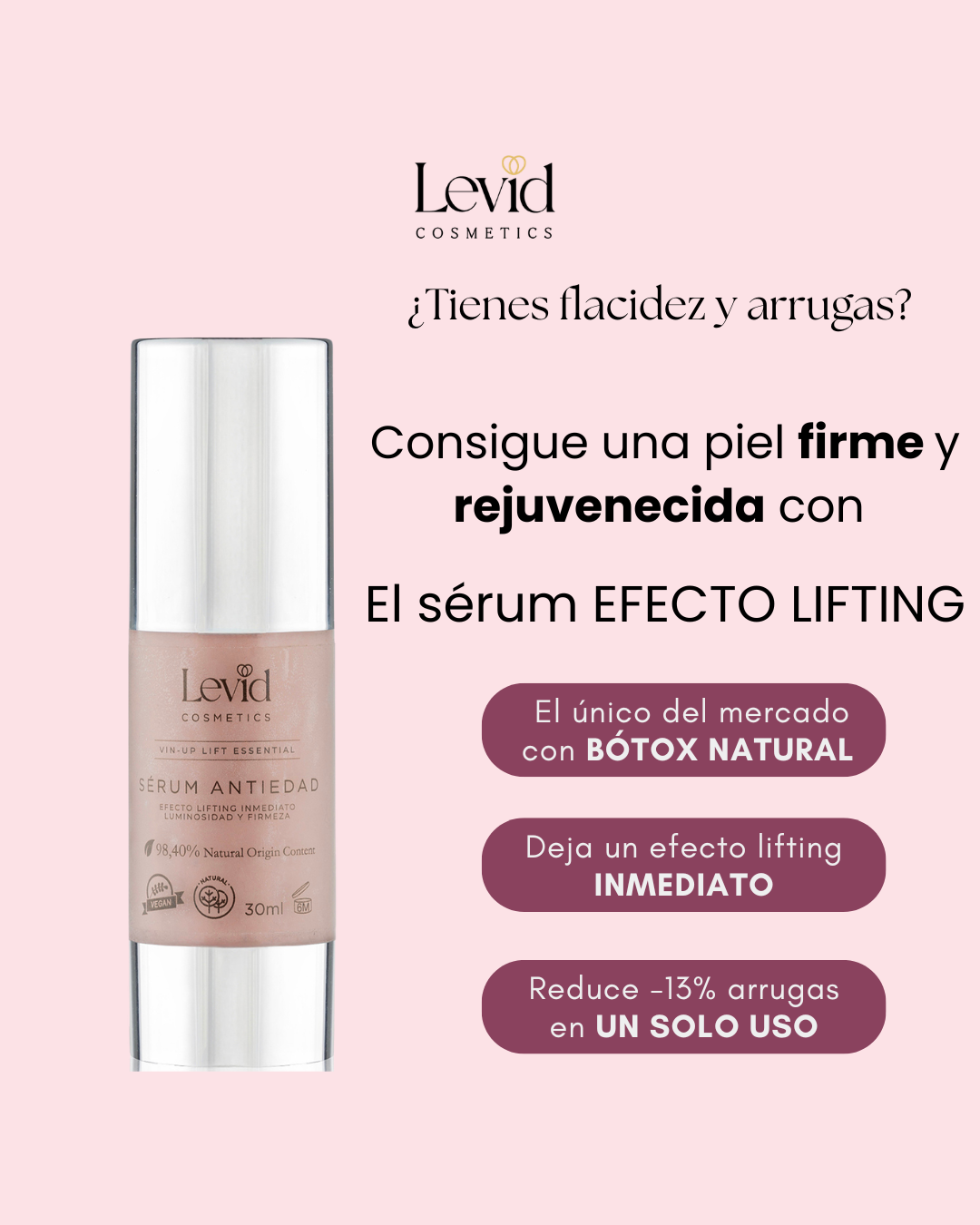 Sérum reafirmante con bótox natural que reduce las arrugas, hidrata, unifica y tersa la piel con efecto lifting.